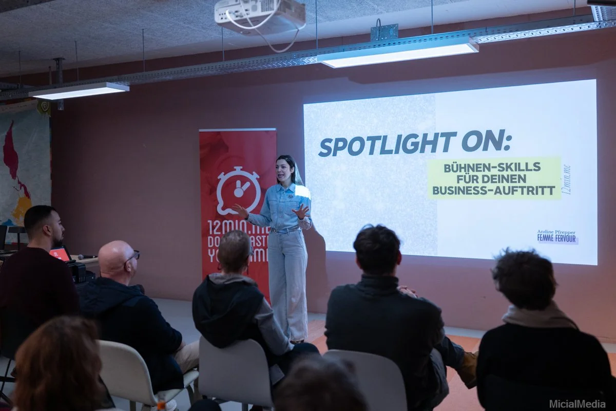 Ein intensiver Trainingstag rund um Bühnenpräsenz im Business-Kontext: vom ersten Schritt auf die Bühne über Story, Stimme und Körpersprache bis zum souveränen Q&A.